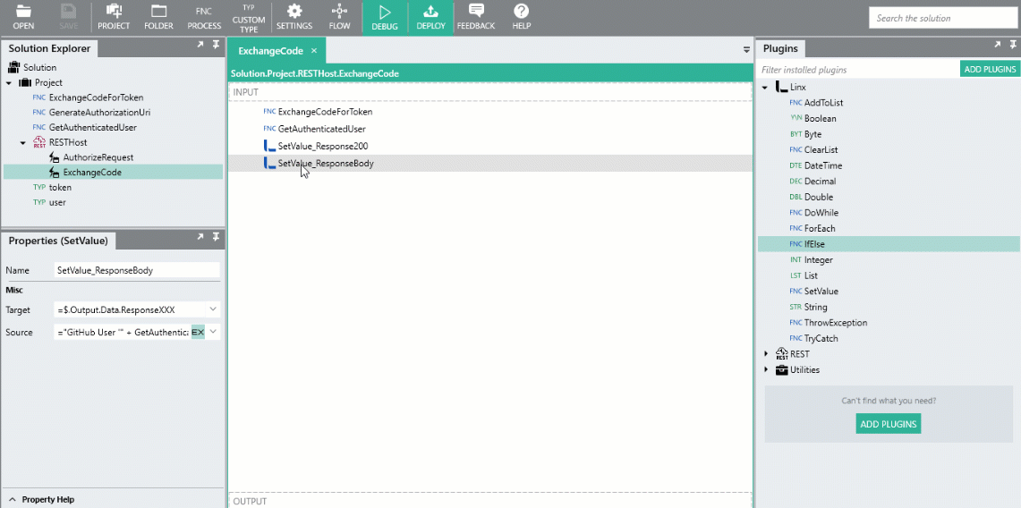 4. Once the ExchangeCodeForToken function completes successfully, we will return a simple text message confirming the successful authentication. First the status code of the response must be set to indicate the result i.e. 200, 401, 403 etc. To do this, drag a SetValue function below the ExchangeCodeForToken function and rename it to SetValue\_Response200.
