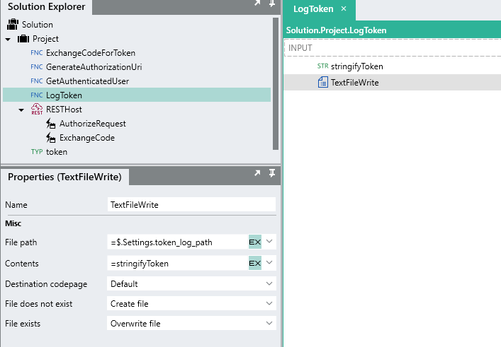 3. Within the LogToken function, add a TextFileWrite function.