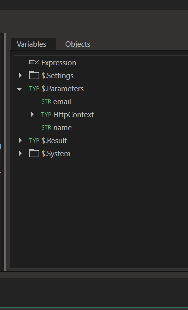 The name and email parameters are then accessible from the $.Parameters of the operation which can be used to do custom processing.