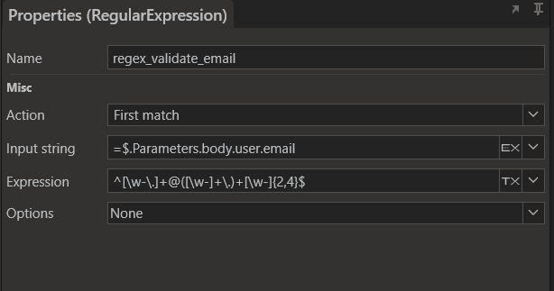 In the below example, the input email field of the User submitted as the request body is validated using a RegularExpression function.