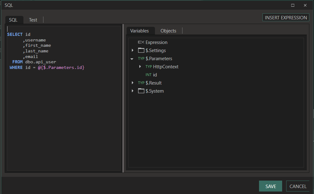 In the below example, the path parameter id is used to query a specific resource from the database using an ExecuteSQL function: